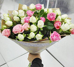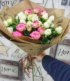 Композиция состоит из кустовых роз белого и розового оттенков. Розовые розы издавна считаются символом искренних чувств, расположенности и надежды на удачное и стремительное развитие отношений. В то же время, белые цветы символизируют чистоту и искренность. Букет уместен не только для подарка любимой девушке, но и как презент близким друзьям.